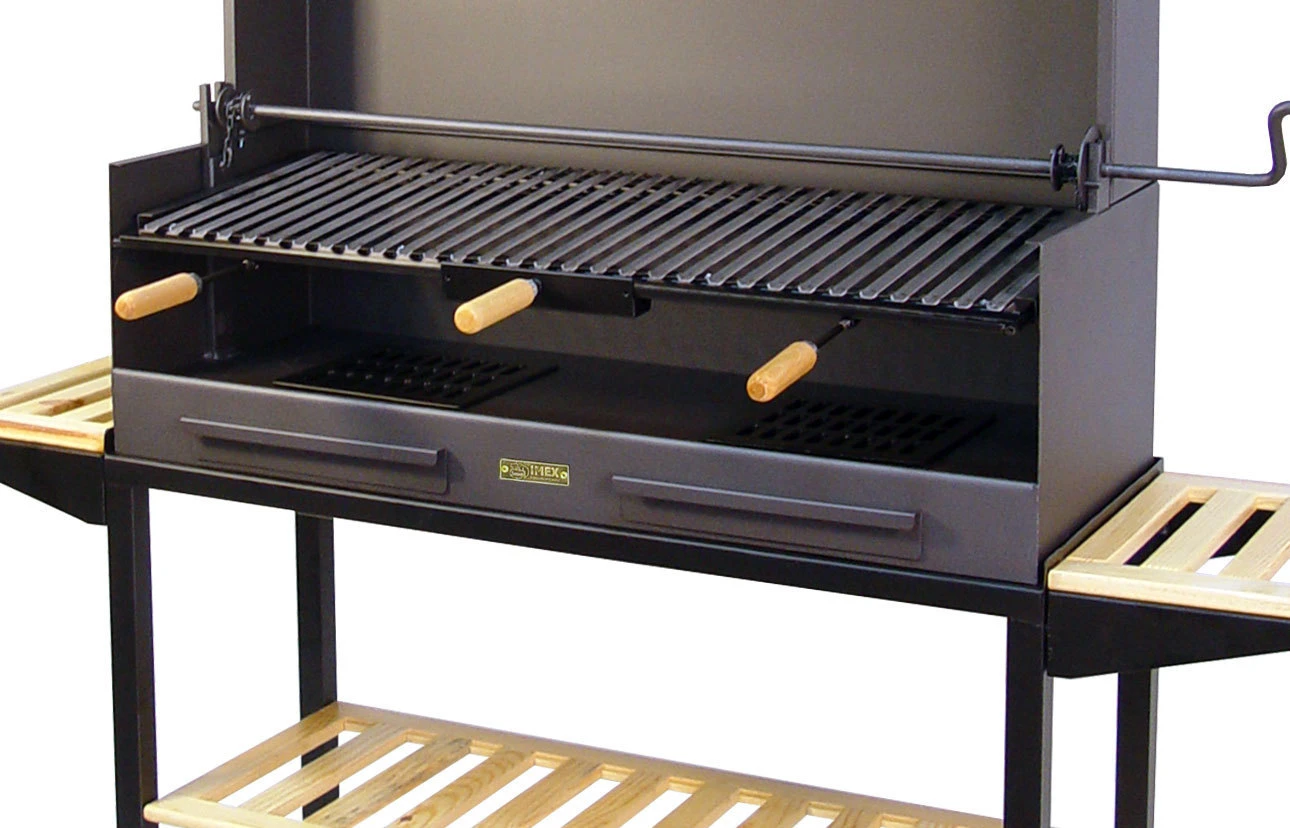 Las barbacoas de Imex El Zorro han sido completamente rediseñadas. Los cambios más relevantes a destacar son: Elegantes ruedas 4×4 para todo tipo de superficie, estantes laterales reforzados de madera, elevador reversible, manivela extraíble, cajón recoge cenizas reforzado, parrilla del hogar de hierro fundido, cuba fabricada en acero de alta resistencia lo que nos permite poder usar leña sin problema.