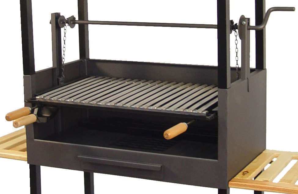 Las barbacoas de Imex El Zorro han sido completamente rediseñadas. Los cambios más relevantes a destacar son: Elegantes ruedas 4×4 para todo tipo de superficie, estantes laterales reforzados de madera, elevador reversible, manivela extraíble, cajón recoge cenizas reforzado, parrilla del hogar de hierro fundido, cuba fabricada en acero de alta resistencia lo que nos permite poder usar leña sin problema.