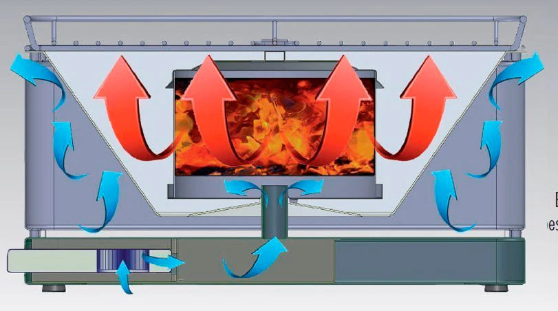 El ventilador sopla aire dentro de la cesta de carbón, lo que acelera el proceso de encendido y se alcanza la temperatura deseada rápidamente. El aire fluye a través del cuerpo de la barbacoa, manteniendo el exterior frío, incluso después de muchas horas de uso.