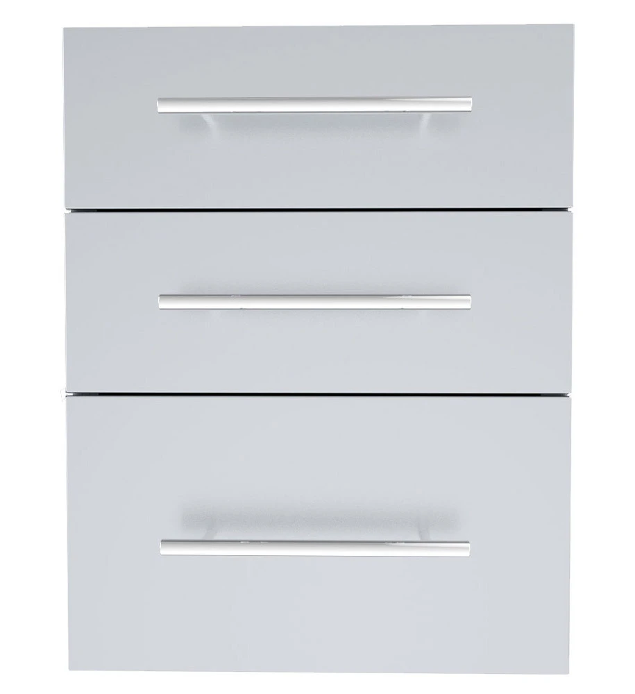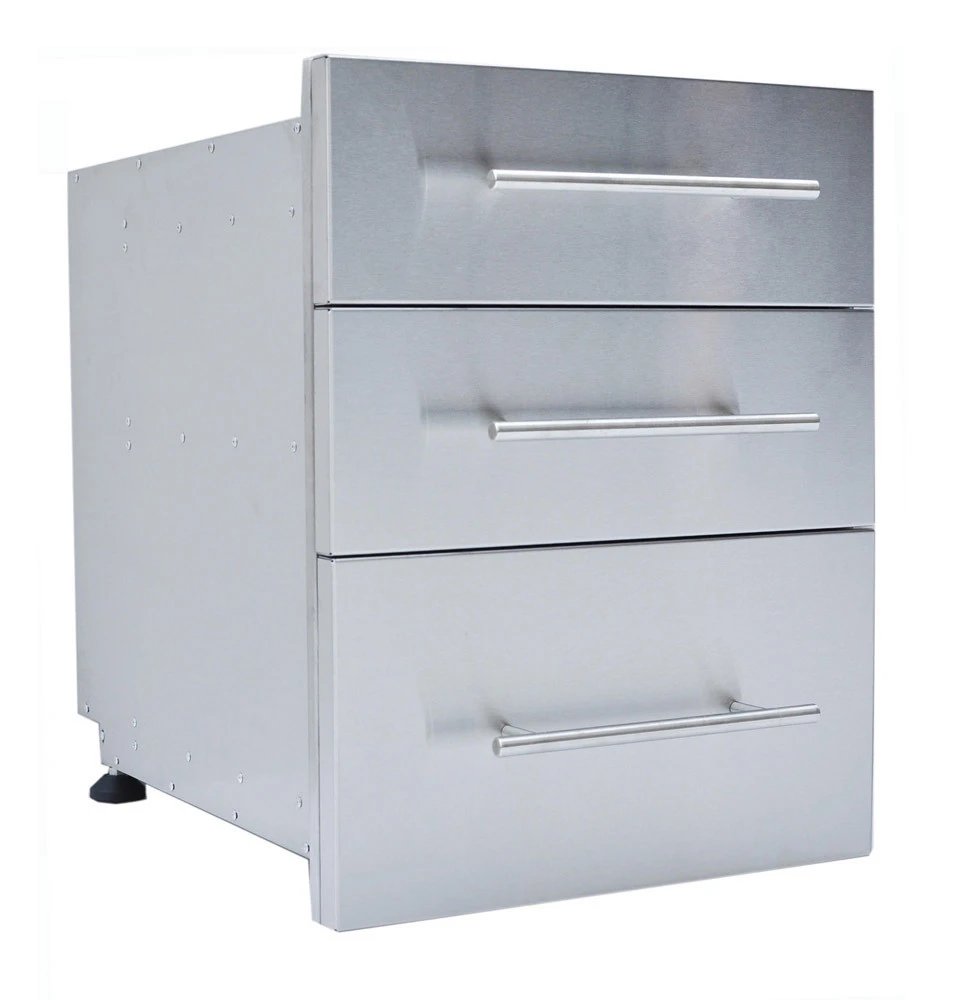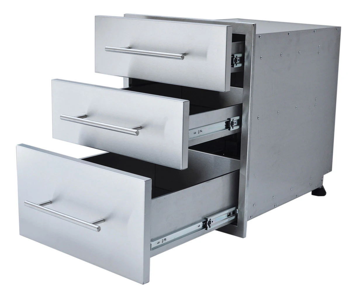 El cajonero triple Designer Series está fabricada con el mismo acabado que las barbacoas Sunstone y con el tirador de acero pulido.