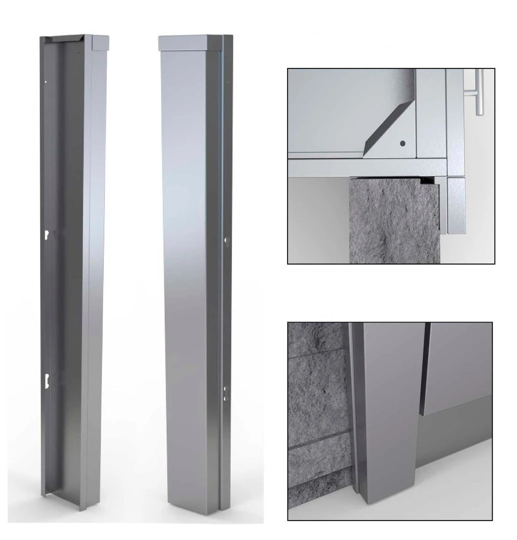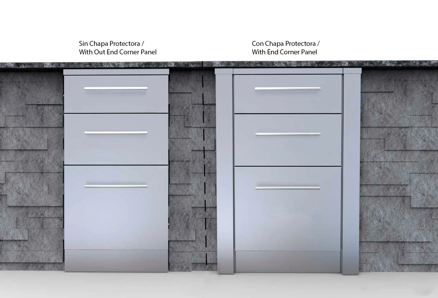 La Chapa Protectora izquierda 7,6 cm. para Módulos Base de Sunstone para el borde frontal de todos los lados izquierdos de los módulos base, para ocultar el borde áspero de la piedra o del marco al colocar cualquier módulo base en una cocina exterior.