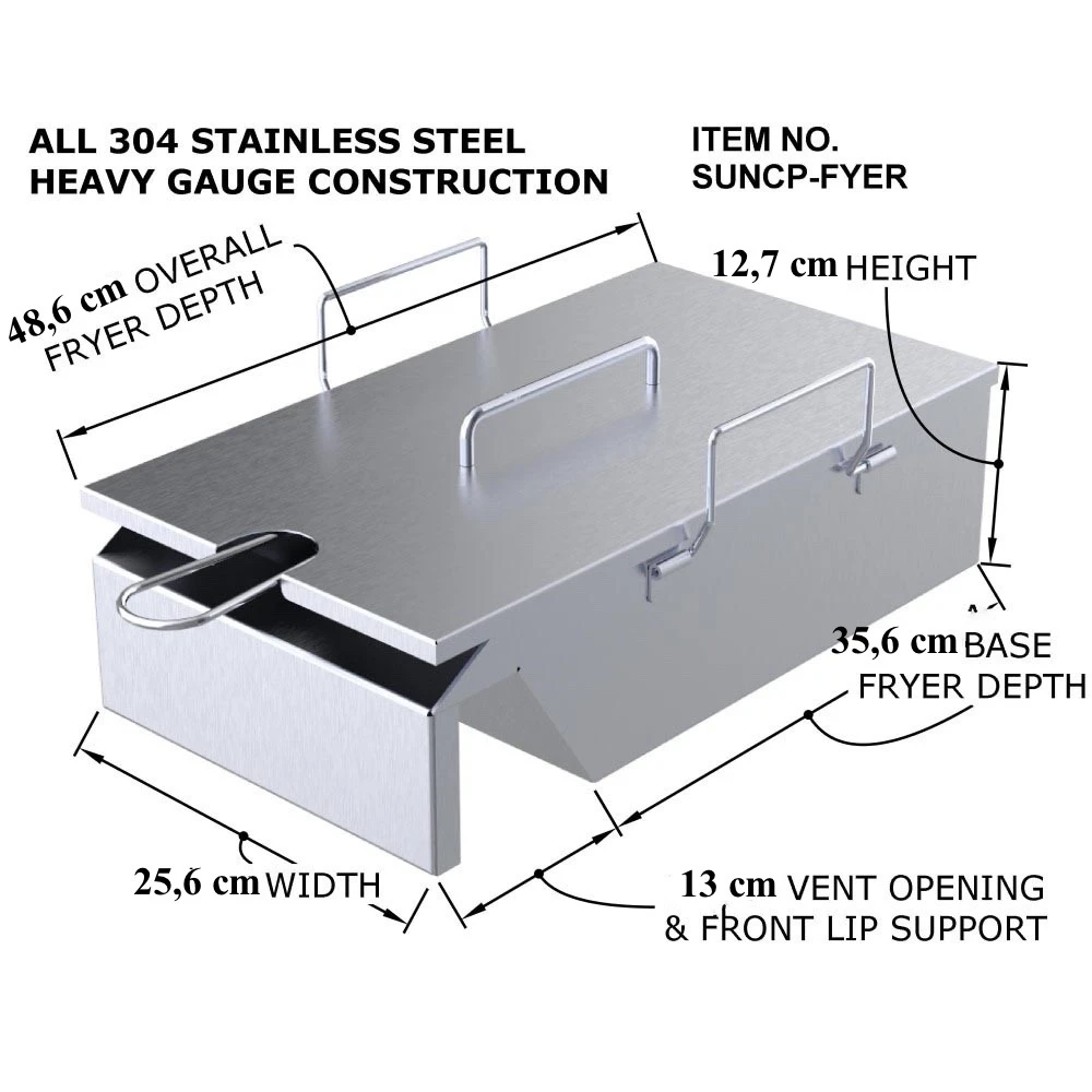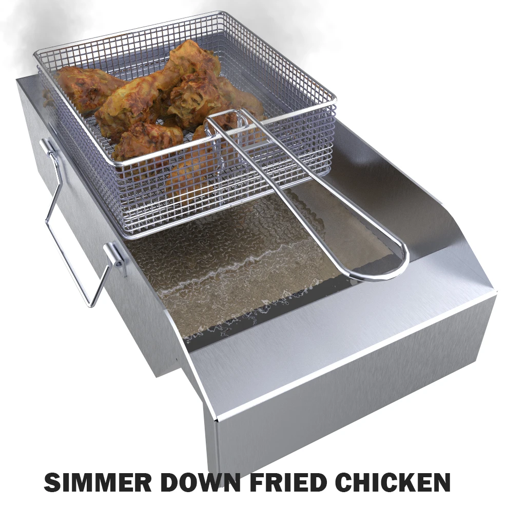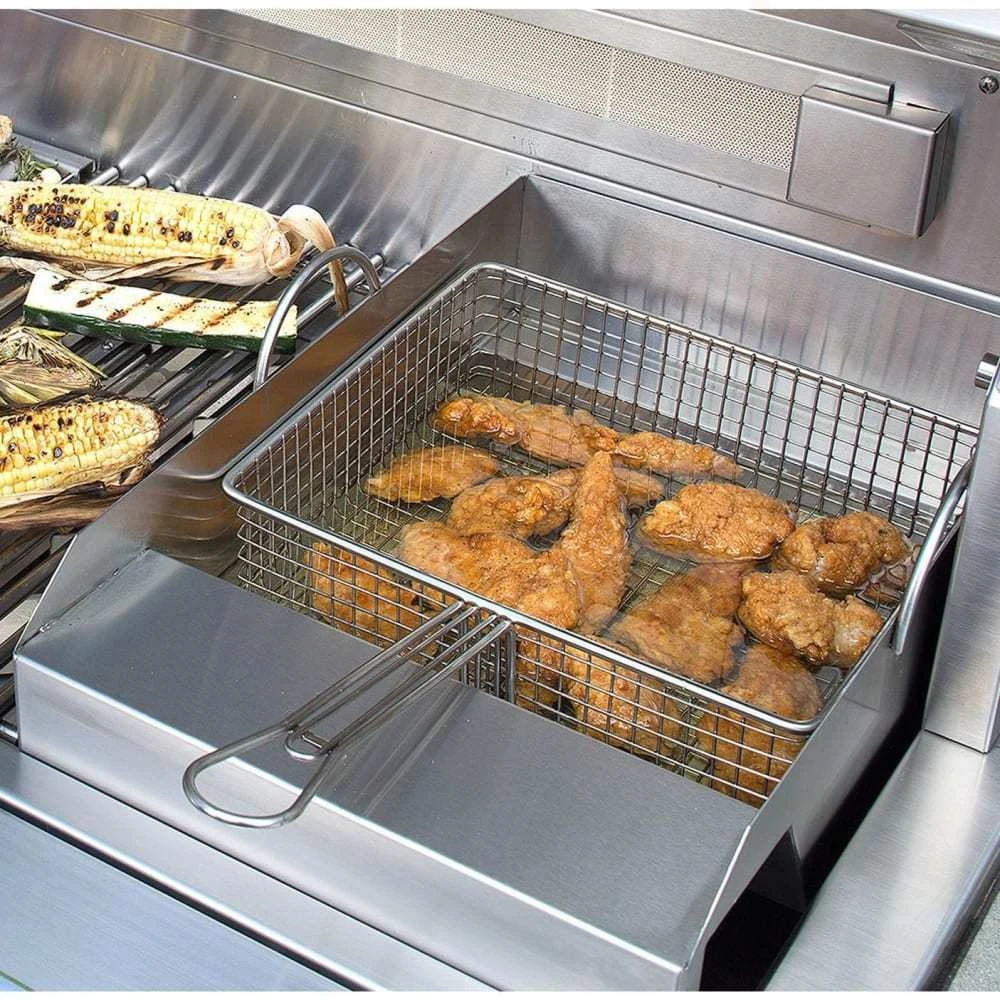 Esta freidora/vaporizador/hervidor de Sunstone cuenta con un depósito y una cesta de Acero Inoxidable para calentar el aceite para freír por ejemplo alitas de pollo, patatas fritas, tempura, etc. directamente sobre cualquier barbacoa Sunstone Ruby y sobre el quemador Infrarrojo Doble Ruby Companion Pro, también se adapta sobre cualquier barbacoa híbrida de Sunstone. Es muy fácil de insertar, simplemente quitando una sola parrilla de cocción de la barbacoa y colocando la freidora en su lugar. Incluye una bandeja perforada para cocinar al vapor verduras y otros alimentos. Trae una cesta de gran tamaño que es perfecta para freir fácilmente todo tipo de alimentos. Esta fabricada de Acero Inoxidable 304 que lo hace resistente a el óxido y la corrosión, además su solida construcción asegura que no se deformará con el uso de altas temperaturas.