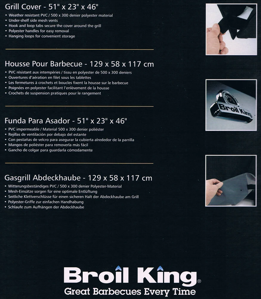 Las fundas Broil King de la gama Select están fabricadas en PEVA (mezcla de plástico y vinilo) son duraderas y resistentes a la imtemperie. La capa exterior de la funda es de poliéster de densidad 500 x 300D.