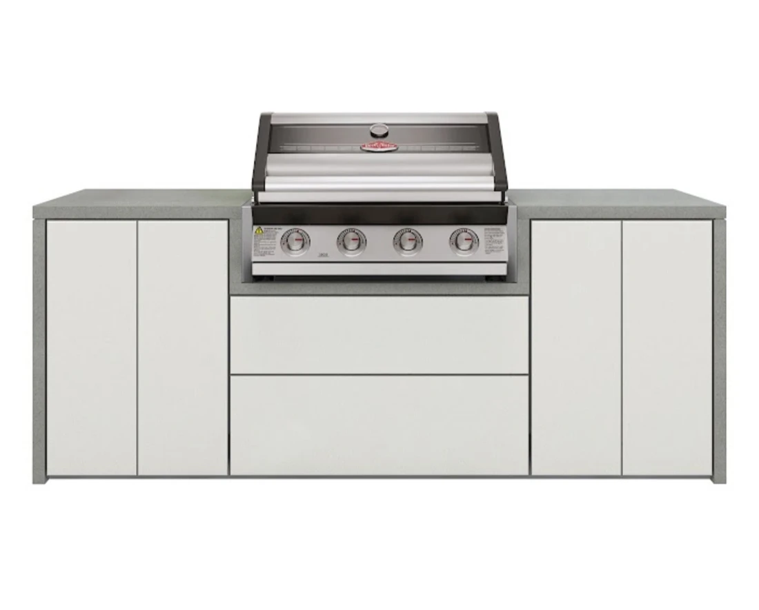 El cuerpo de las islas de exterior Beefeater está fabricado con madera de eucalipto contrachapada de grado marino resistente a la humedad y rematada con un laminado de color blanco fácil de limpiar.