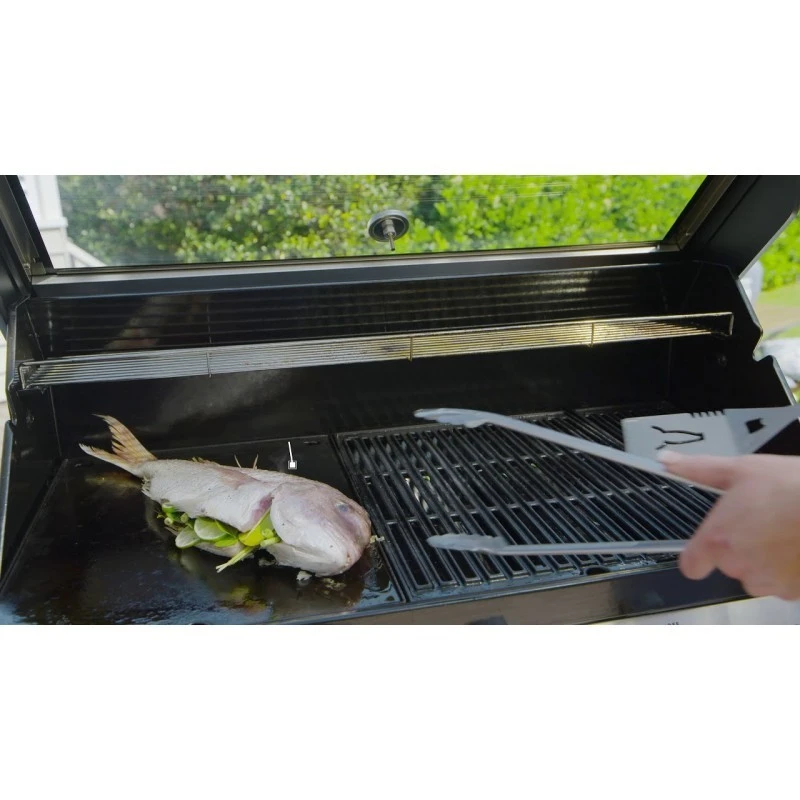 – Barbacoa de gas de 4 quemadores de hierro fundido con tapa horno de porcelana vitrificada en negro y cuerpo construído en Acero Inoxidable grado 304.