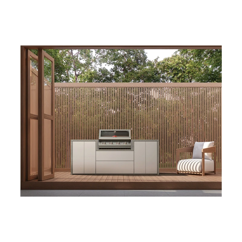 El área dónde va encastrada la barbacoa está revestida con encimera de cuarzo para soportar el calor alto que se emite durante la cocción, protegiendo así los armarios de daños por el calor.