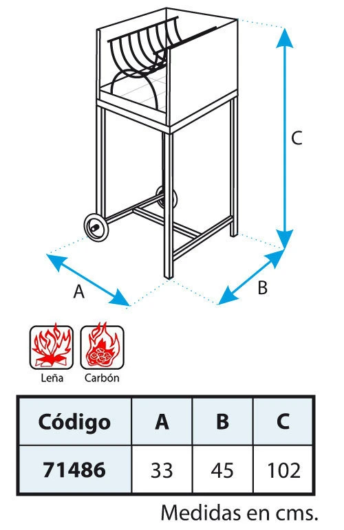 Cajón con carro fabricado en hierro forjado con pintura resistente a 800 ºC, soporte para la leña y base de ladrillo refractario.