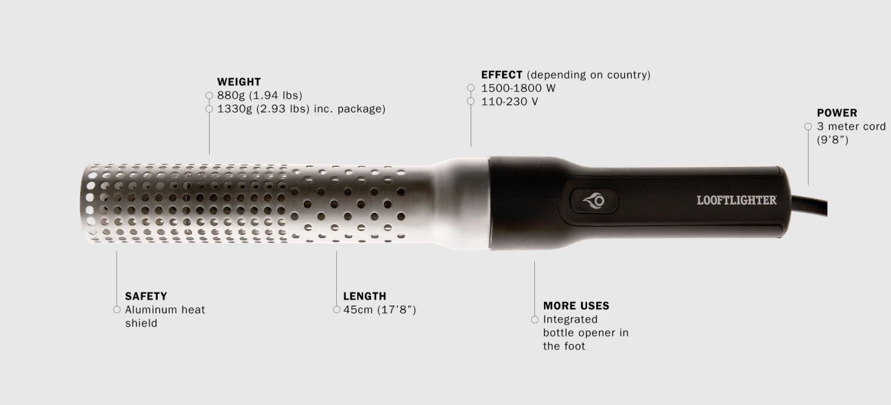 Looftlighter es un original invento sueco patentado. Looftlighter enciende su barbacoa o chimenea con aire caliente a 680º C en 60 segundos sin añadir líquidos de encendido. También puede avivar su barbacoa y hacer posible que pueda empezar a cocinar en sólo un par de minutos.