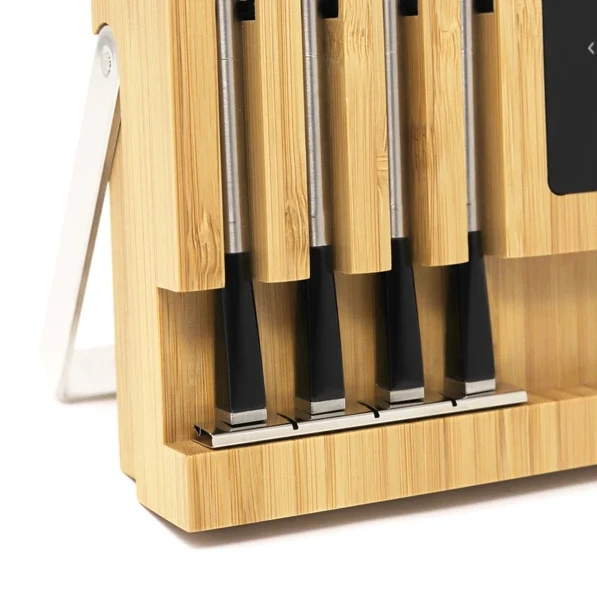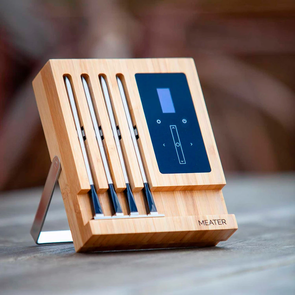 El bloque de madera de los termómetros de carne MEATER almacena, carga sus sondas MEATER y funciona como el repetidor de señal Bluetooth.
