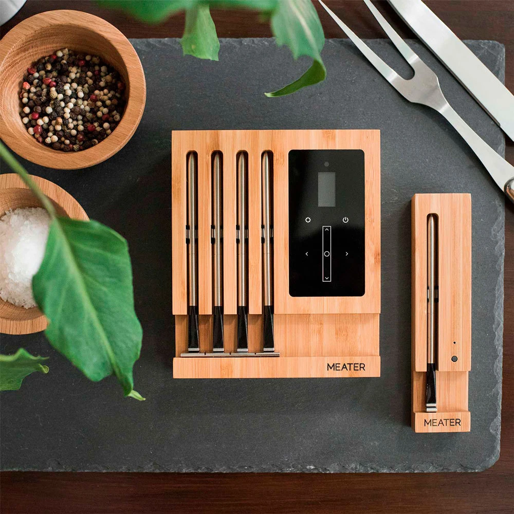 MEATER Block es el conjunto de cuatro termómetros inalámbricos inteligentes para carne con Bluetooth y WiFi. Es una herramienta versátil que se puede usar tanto para cocinar en barbacoas, smokers, kamados, hornos o incluso en la plancha o la sartén en la cocina de tu casa midiendo la temperatura interna de la carne.