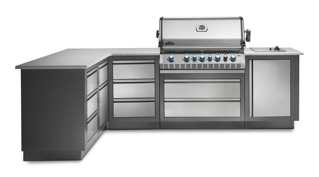 La cocina exterior perfecta cuenta con mucho espacio de almacenamiento y un acabado duradero que resistirá a los elementos. El módulo de tres cajones Oasis tiene los frontales de los cajones de Acero Inoxidable con una gran cantidad de almacenamiento para sus accesorios Napoleon y especias para asar.