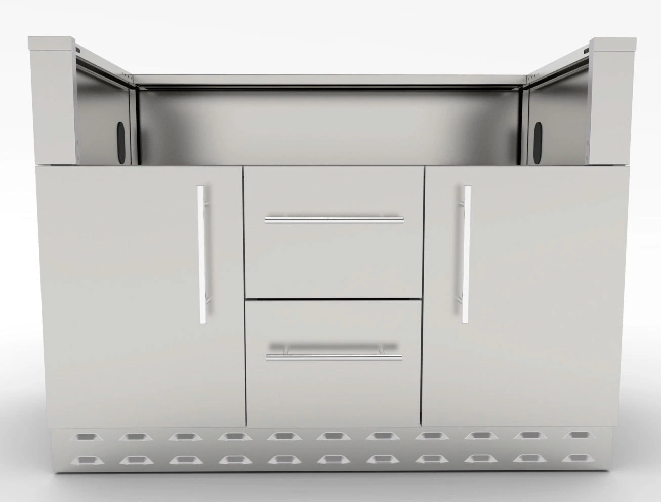 El módulo Inox. de 116 cm. para barbacoa de gas, está construido enteramente de Acero Inoxidable grado 304 del calibre 16 y 18. Además de servir para las barbacoas Sunstone de 5 quemadores, este módulo también está diseñado para alojar múltiples barbacoas de gas de otras marcas del mercado. El módulo se compone de dos puertas laterales con alojamiento para la botella de gas o cubo de basura ya que el estante inferior es extraible. La puerta izquierda incluye una repisa a media altura, la cual es extraíble para instalarse en la puerta derecha si así se desea. Entre las dos puertas se sitúan 2 cajones grandes y amplios, ideal para guardar todos nuestros utensilios, condimentos, etc.