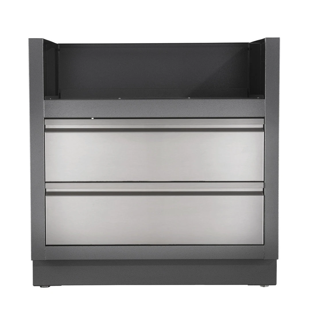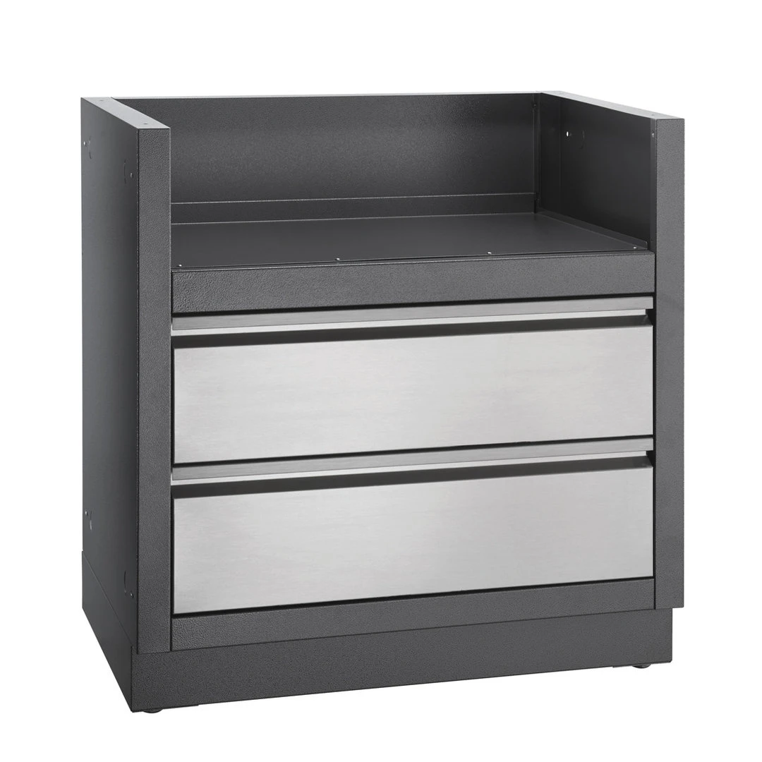 Dos cajones de Acero Inoxidable están montados sobre raíles de suave deslizamiento para el almacenaje debajo de la barbacoa. La instalación es muy sencilla gracias a los orificios para el gas y la electricidad. Las patas de nivelación garantizan una superficie nivelada, incluso si la zona de instalación no está perfectamente nivelada.