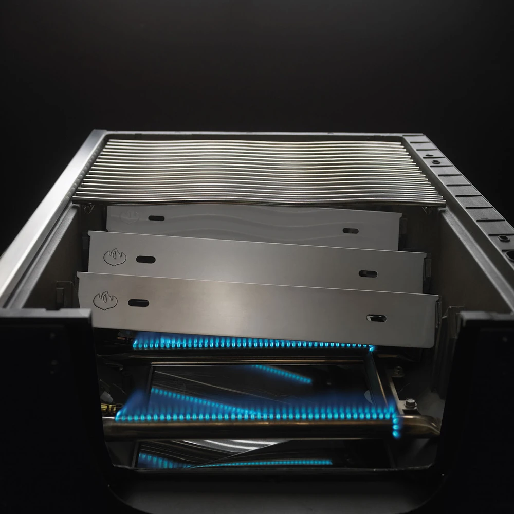 Los protectores de llama de Acero Inoxidable 304 de doble nivel de Napoleon proporcionan una gran cobertura para dispersar el calor uniformemente procedente de los quemadores inferiores. La forma de ^ de los protectores de llama hace que la grasa caiga rápidamente, evitando que se produzcan llamaradas. El diseño de doble nivel de los protectores de llama proporciona una protección adicional asegurando que los goteos se evaporen, incluso entre cada quemador. Cada protector de llama tiene un orificio, lo que facilita ver los quemadores que están encendidos, desde la superficie de la parrilla.