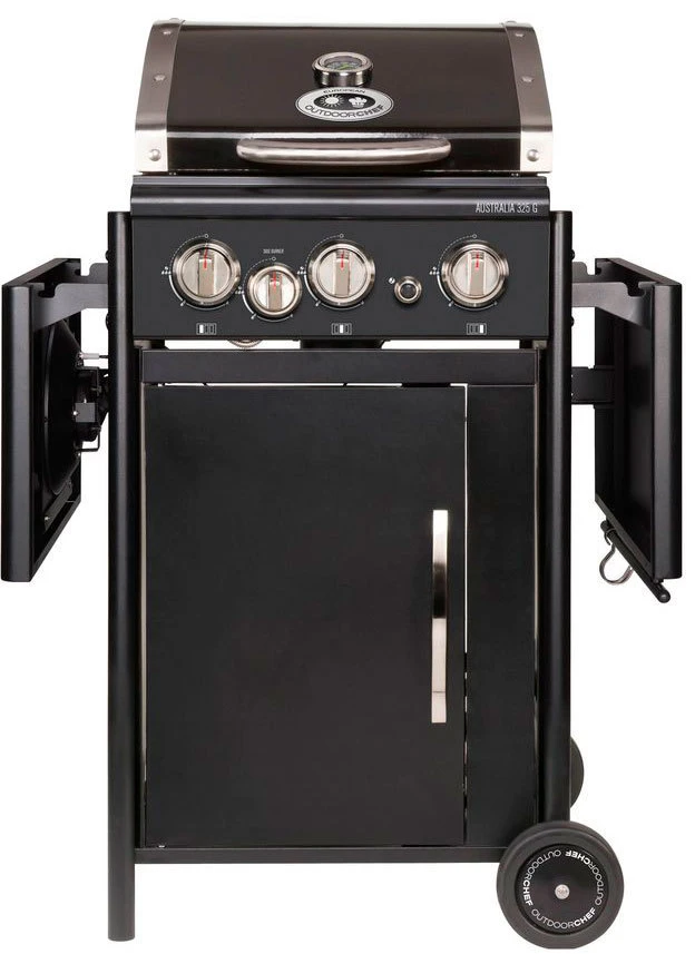 El modelo de barbacoa Australia 325 G incluye tres quemadores de Acero Inoxidable con una potencia total de 7,5 kW, quemador lateral, encendido electrónico, termómetro incorporado en la tapa, mueble con ruedas, puerta con almacenamiento, mesas laterales, y mucho más.