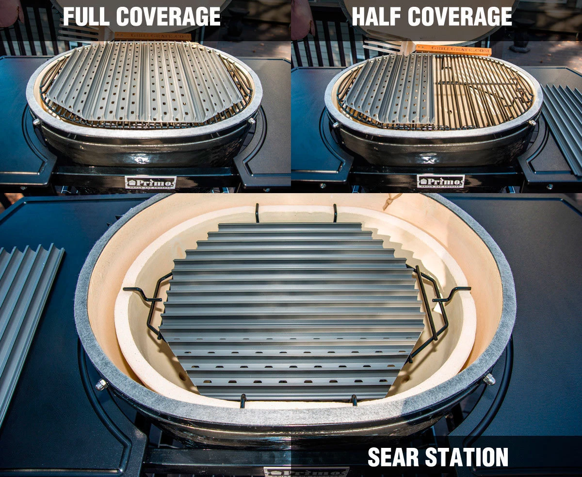 Este modelo de GrillGrate se compone de 4 piezas de 44,14 x 13,34 cm. (Fondo x Ancho) y encaja perfectamente en el modelo de Kamado Primo Oval XL.